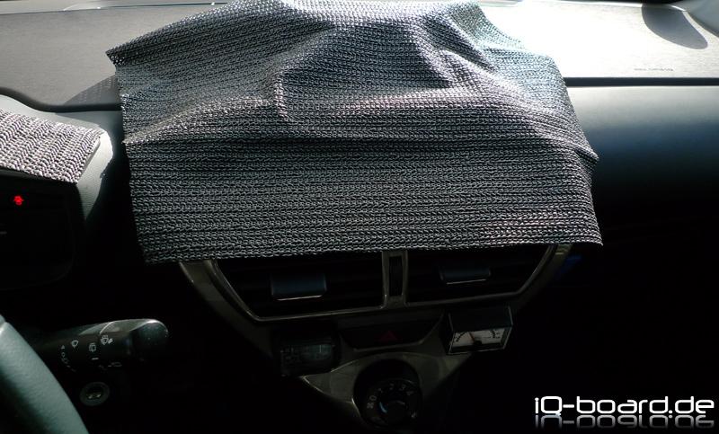 Die erste Generation vom Toyota IQ hat bei von vorne kommender tiefstehender Sonne ein Problem mit der sehr stark blendenden Mittelkonsolen-Lackierung.