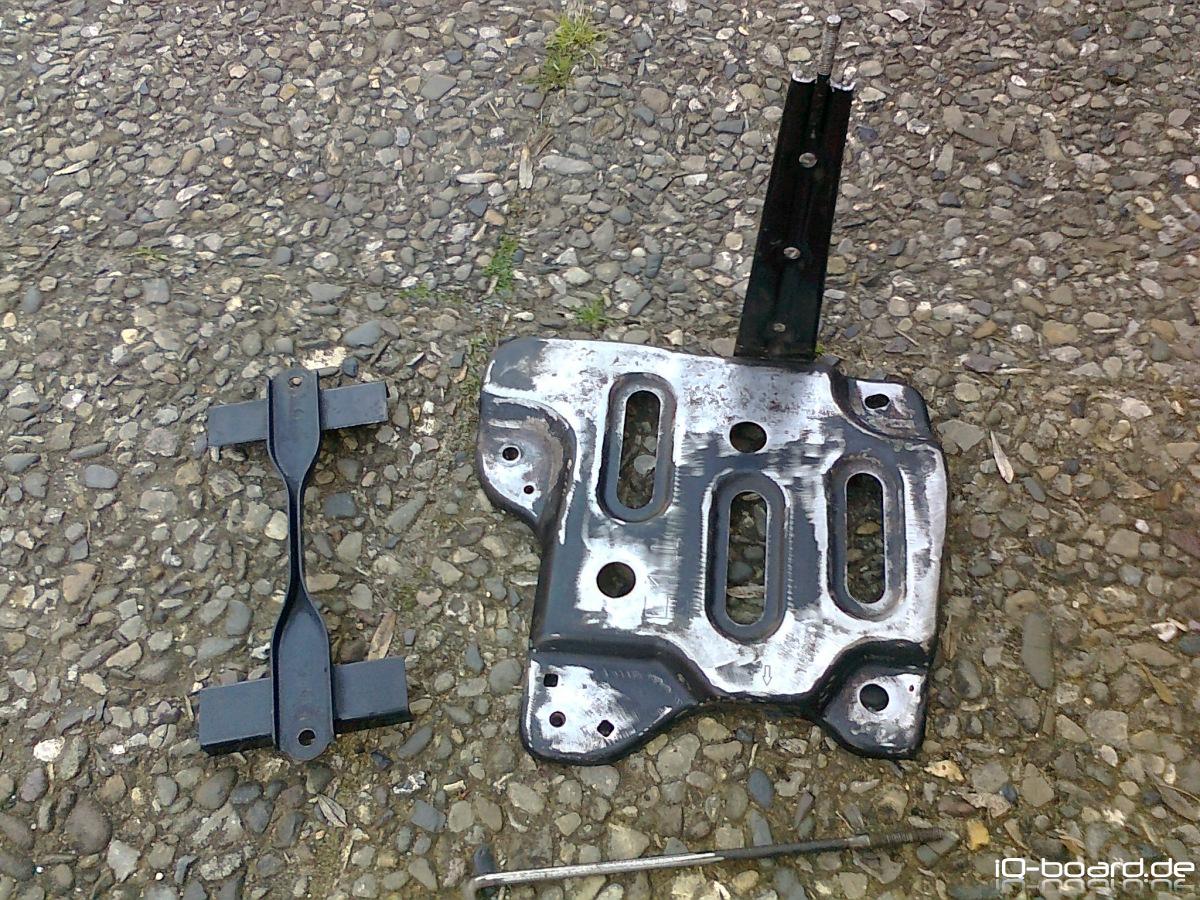 Batteriehalterung; nicht nur augenscheinlich entrostet, sondern auf größere EU Batterie (andere Polreihenfolge) umgebaut und in der Höhe die Gewinde gekürzt.