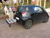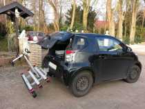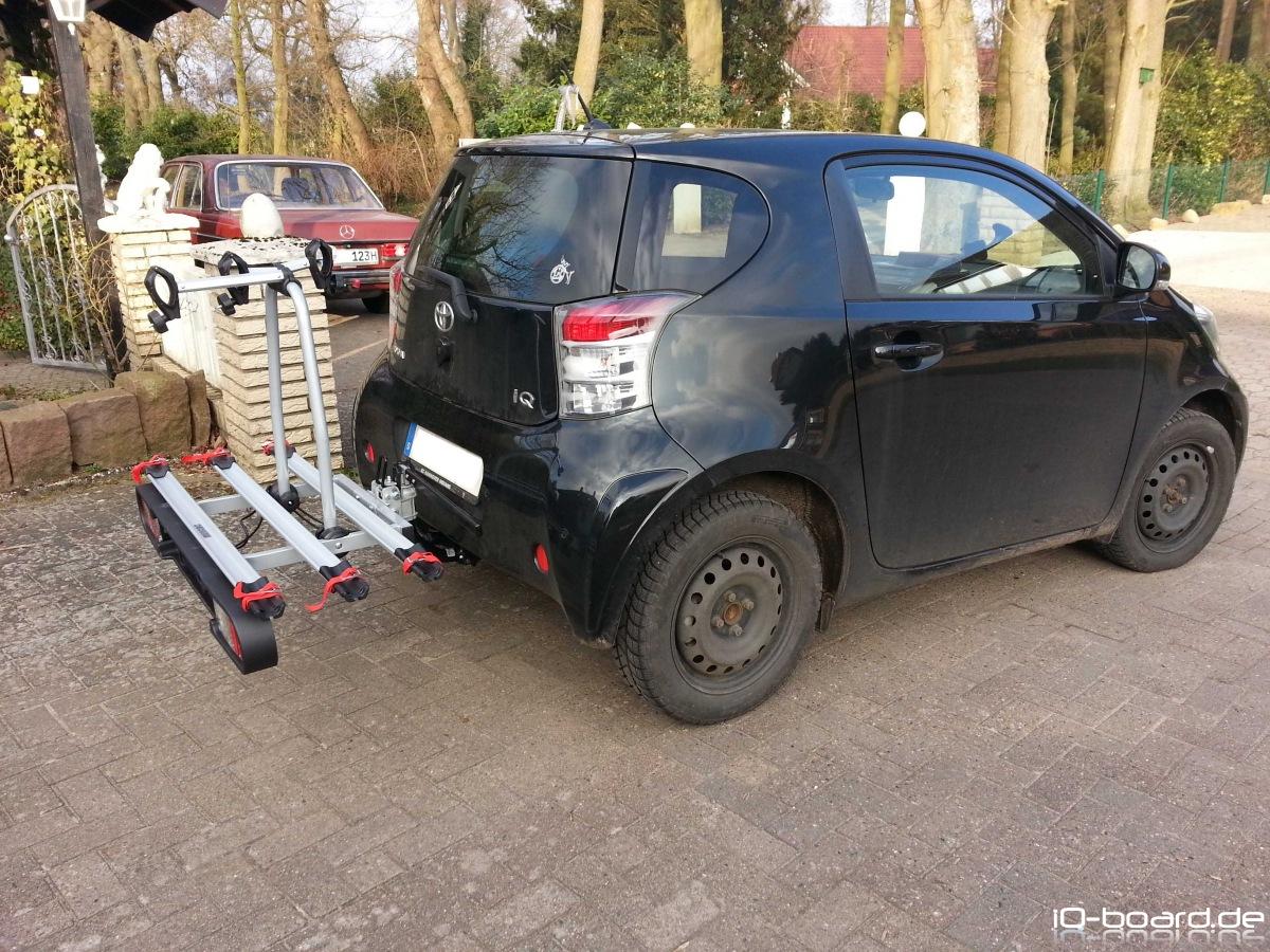 Anbei zwei Bilder vom iQ mit dem Fahrradträger auf der Anhängerkupplung (wenn ich mir das so ansehe, hätte ich den Wagen vielleicht auch mal wieder waschen können):